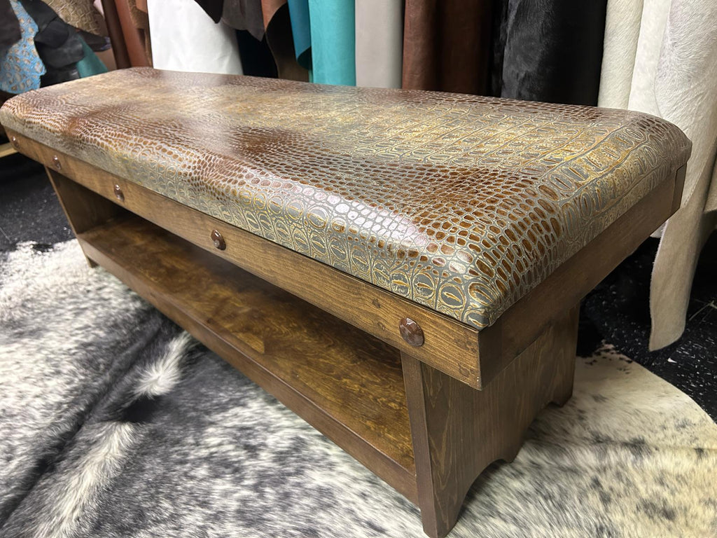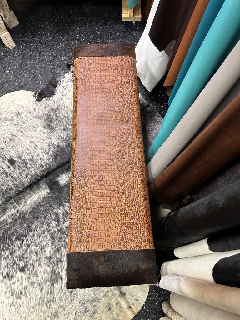Cowhide Bench Brown Brindle Cowhide and Embossed Tan Crocodile Leather - 5 Foot Solid Wood Bench