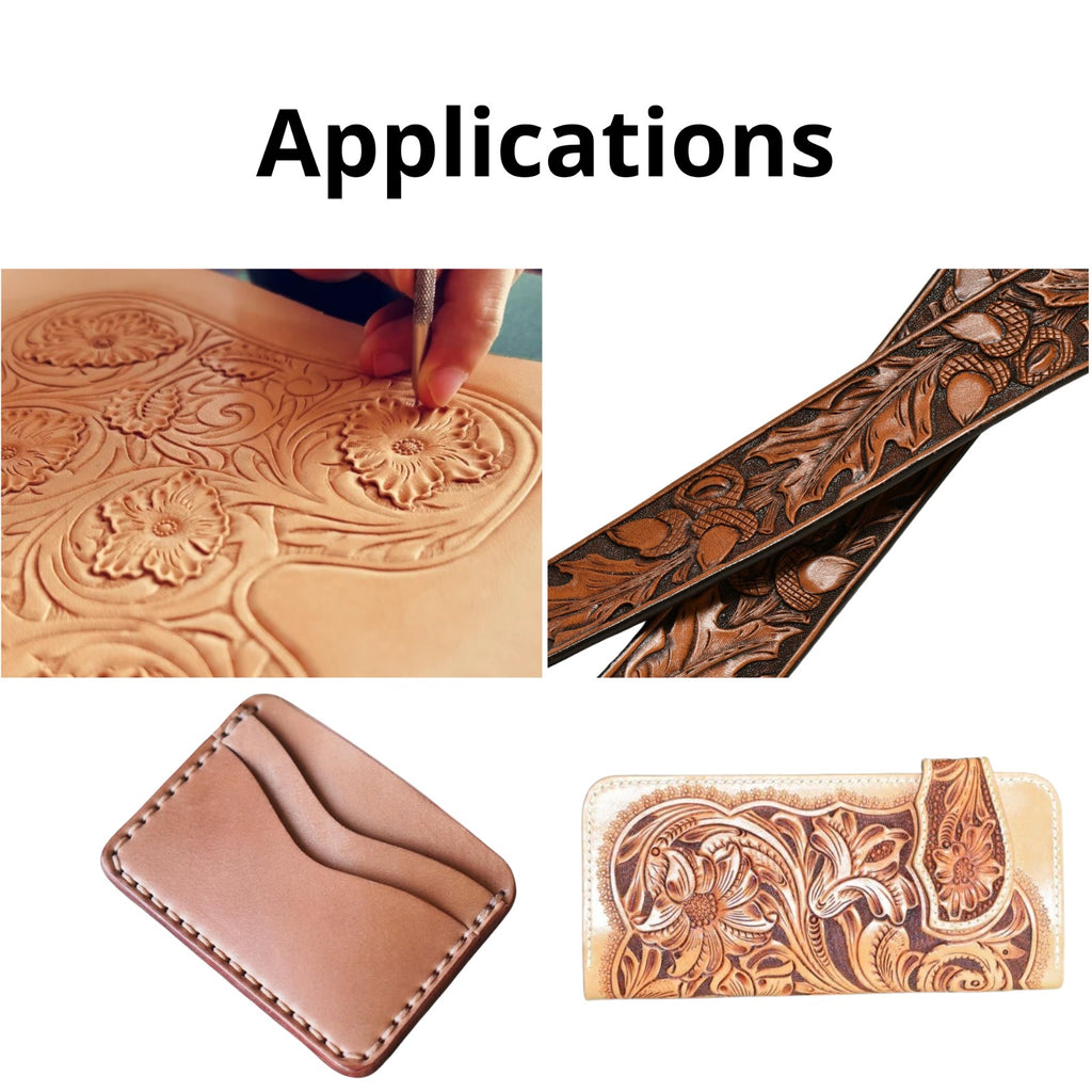 APPLICATIONS: Fit for all Leather Craft Projects: Tooling, Engraving, Stamping, Molding, Dyeing, Knife sheath, Gun holsters, Guitar covers & straps, furniture, Leather Armor, Jewelry Boxes, Map Tube Boxes, Insoles, Shoes, Hats, Belts, Straps, iPhones Cases, Ipad Covers, Airpod Covers, Collars, Leashes, Armor, Saddles, Western Crafts, Belts, Straps, Strips, and many other kinds of leather projects.