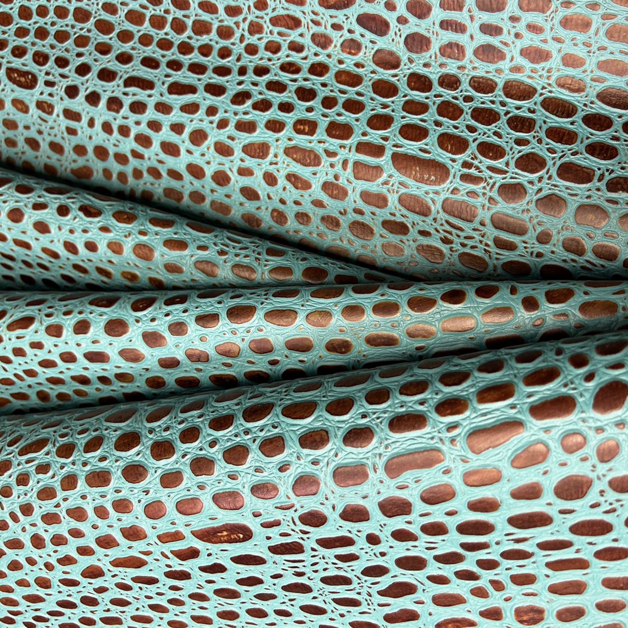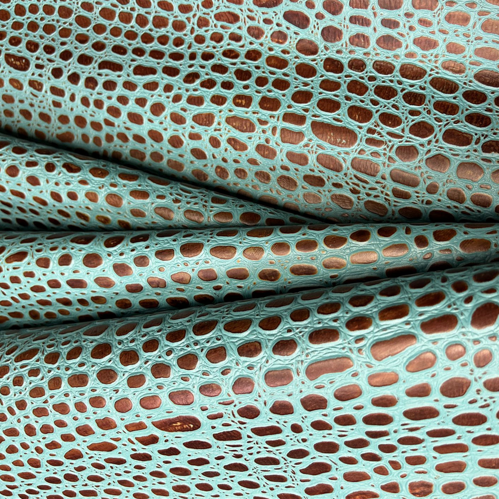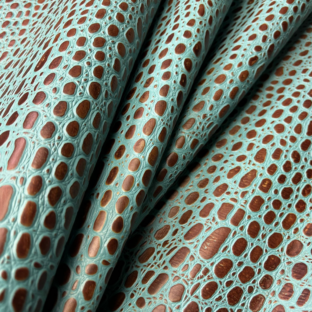 A premium production Tanned Leather specifically for Artisan Cowhide Leather for a reliable and consistent quality product. Turquoise Brown Leather EMBOSSED CROCODILE LEATHER is a Embossing Leather, slightly firm and having no rigid qualities. When worked display smooth, even folds.