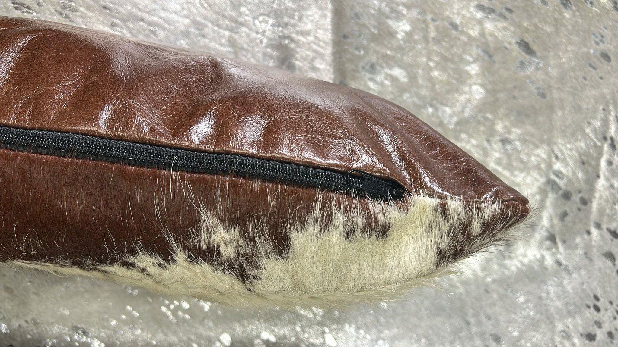 This pillow is Reddish Brown & White hair on hide on one side and Brown Distressed leather on the other side.