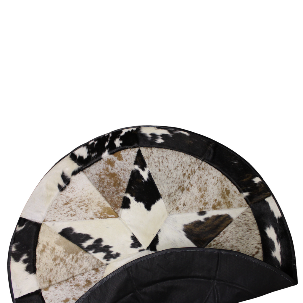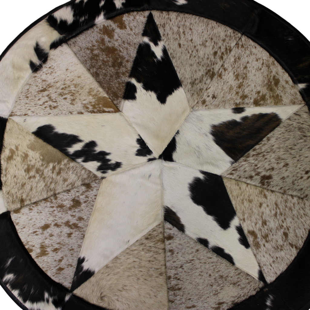 This Round Patchwork Cow Hide Rugs has a special detailed geometric Star figure, zig zag stitching that gives a sophisticated and unique touch.