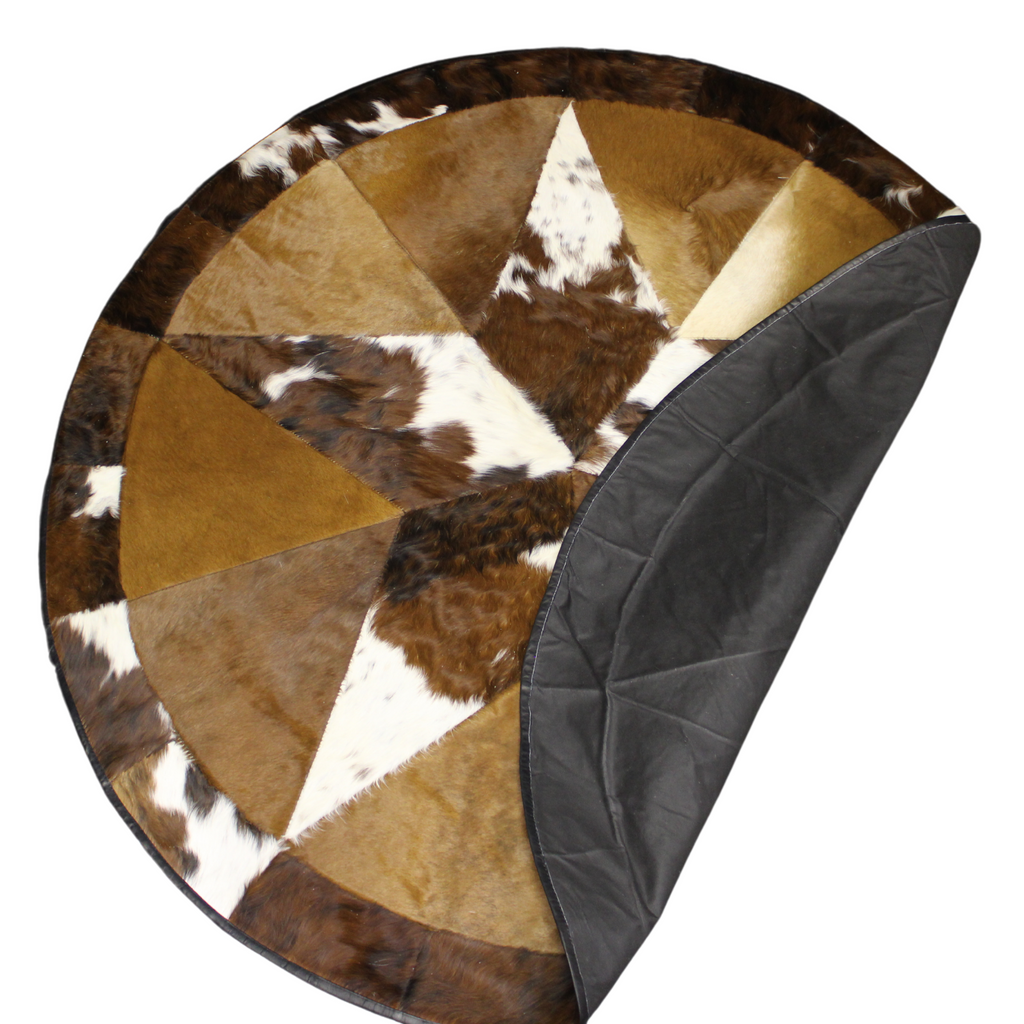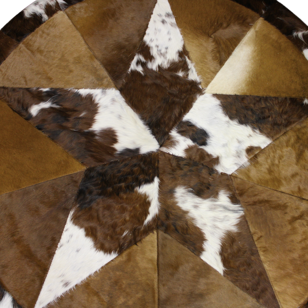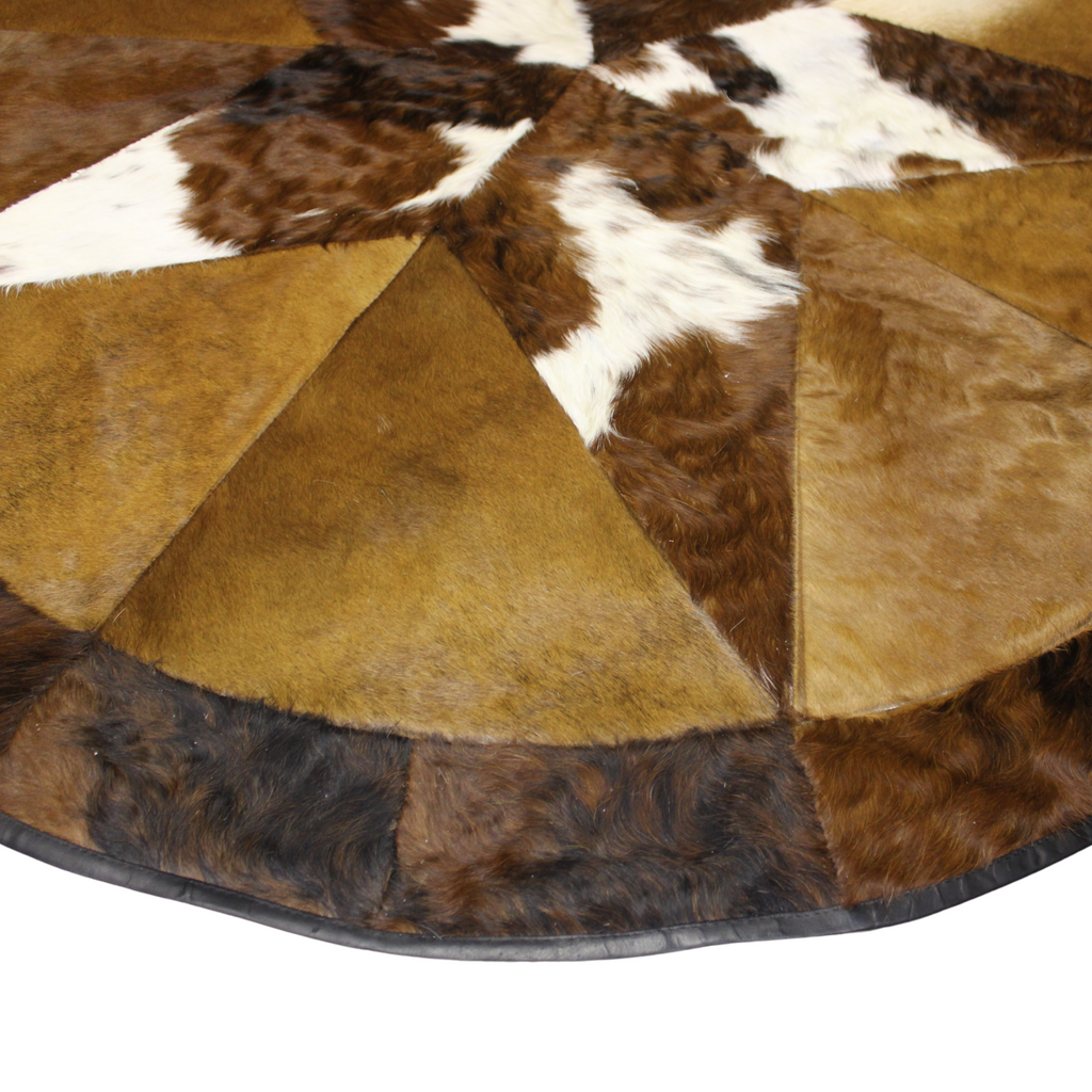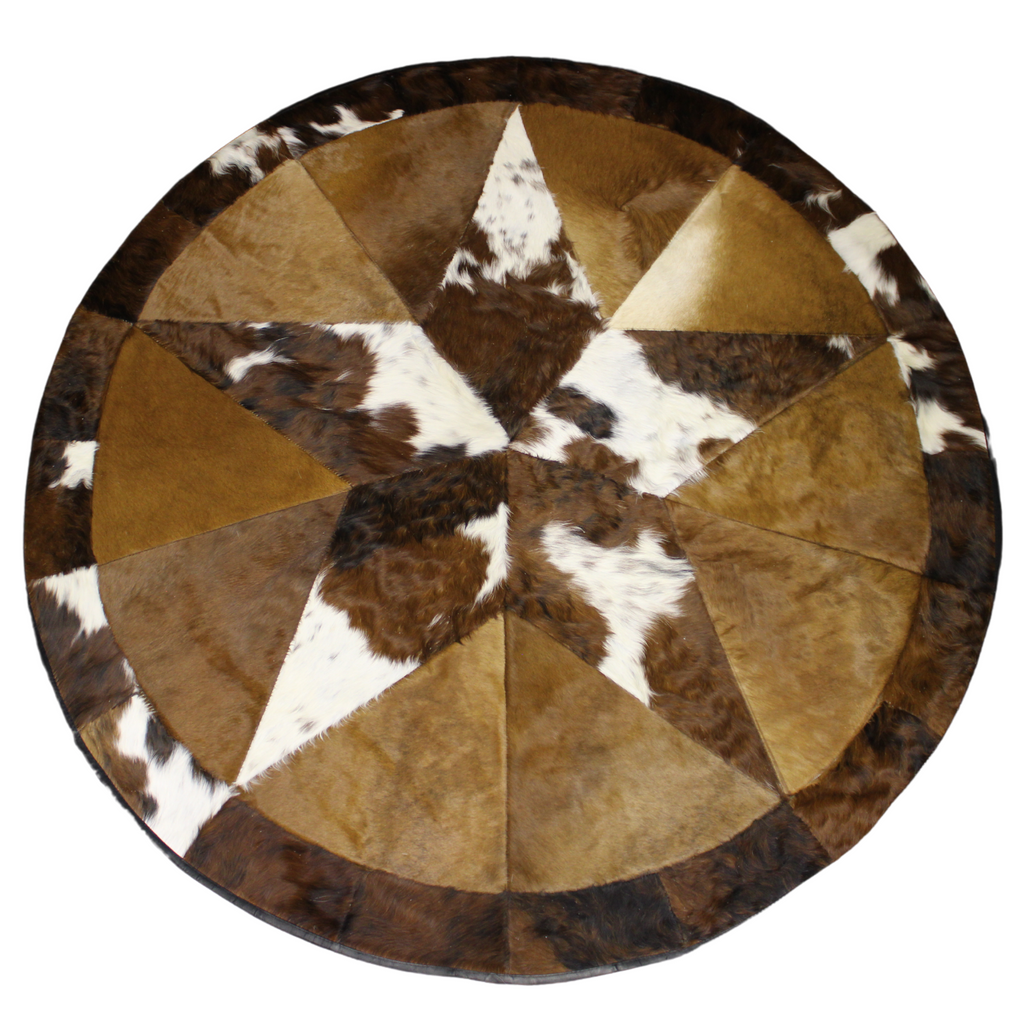 This Round Patchwork Cow Hide Rugs has a special detailed geometric Star figure, zig zag stitching that gives a sophisticated and unique touch. Our round Patchwork Cow Skin Rug bring a distinctive elegance factor and great style to your home or office.