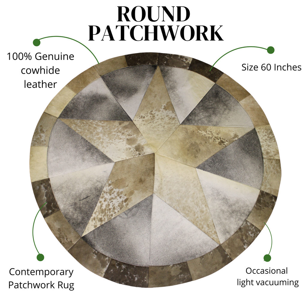 This Round Patchwork Cow Hide Rugs has a special detailed geometric Star figure, zig zag stitching that gives a sophisticated and unique touch. Our round Patchwork Cow Skin Rug bring a distinctive elegance factor and great style to your home or office.