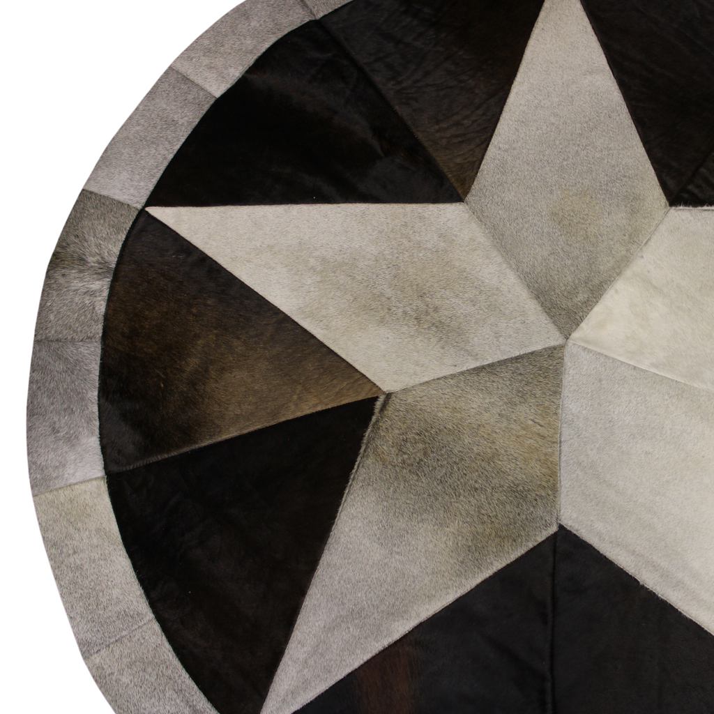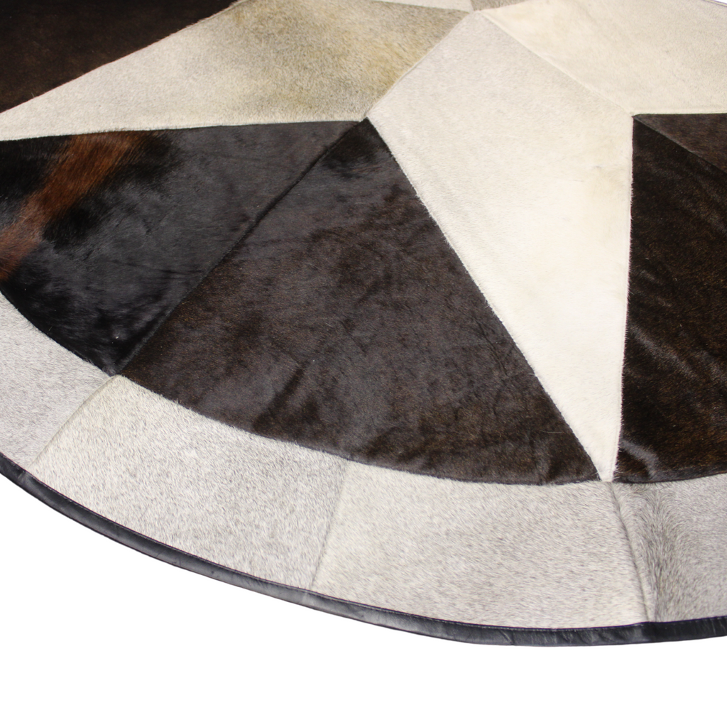 This Round Patchwork Cow Hide Rugs has a special detailed geometric Star figure, zig zag stitching that gives a sophisticated and unique touch. Our round Patchwork Cow Skin Rug bring a distinctive elegance factor and great style to your home or office.