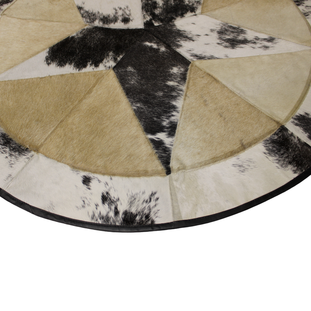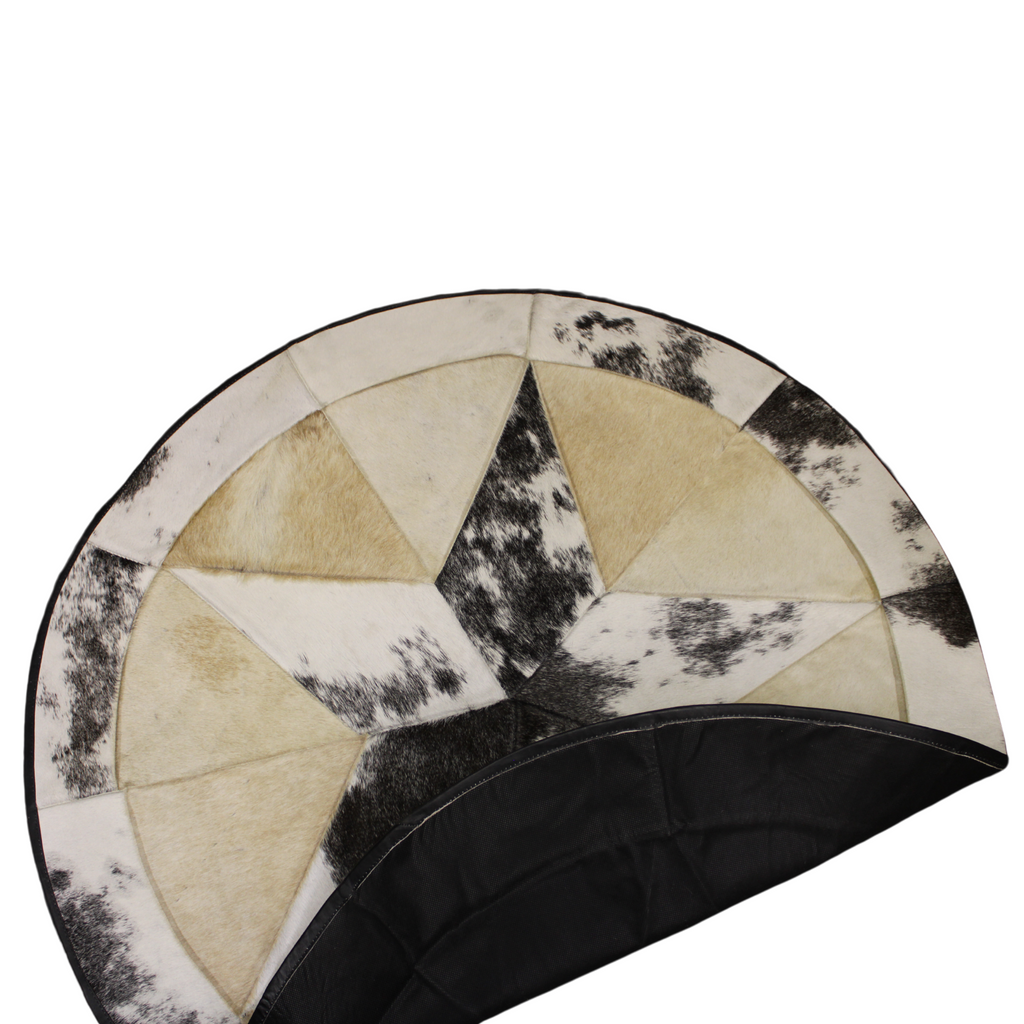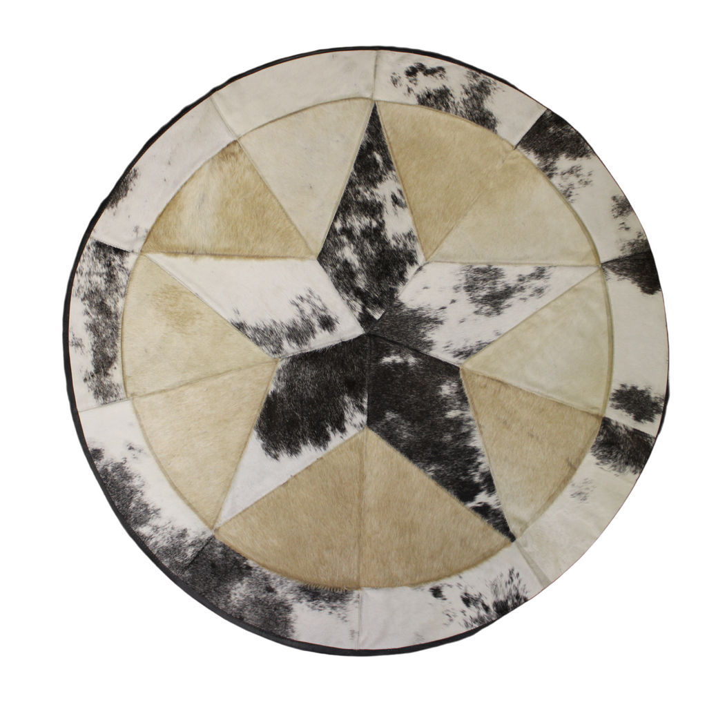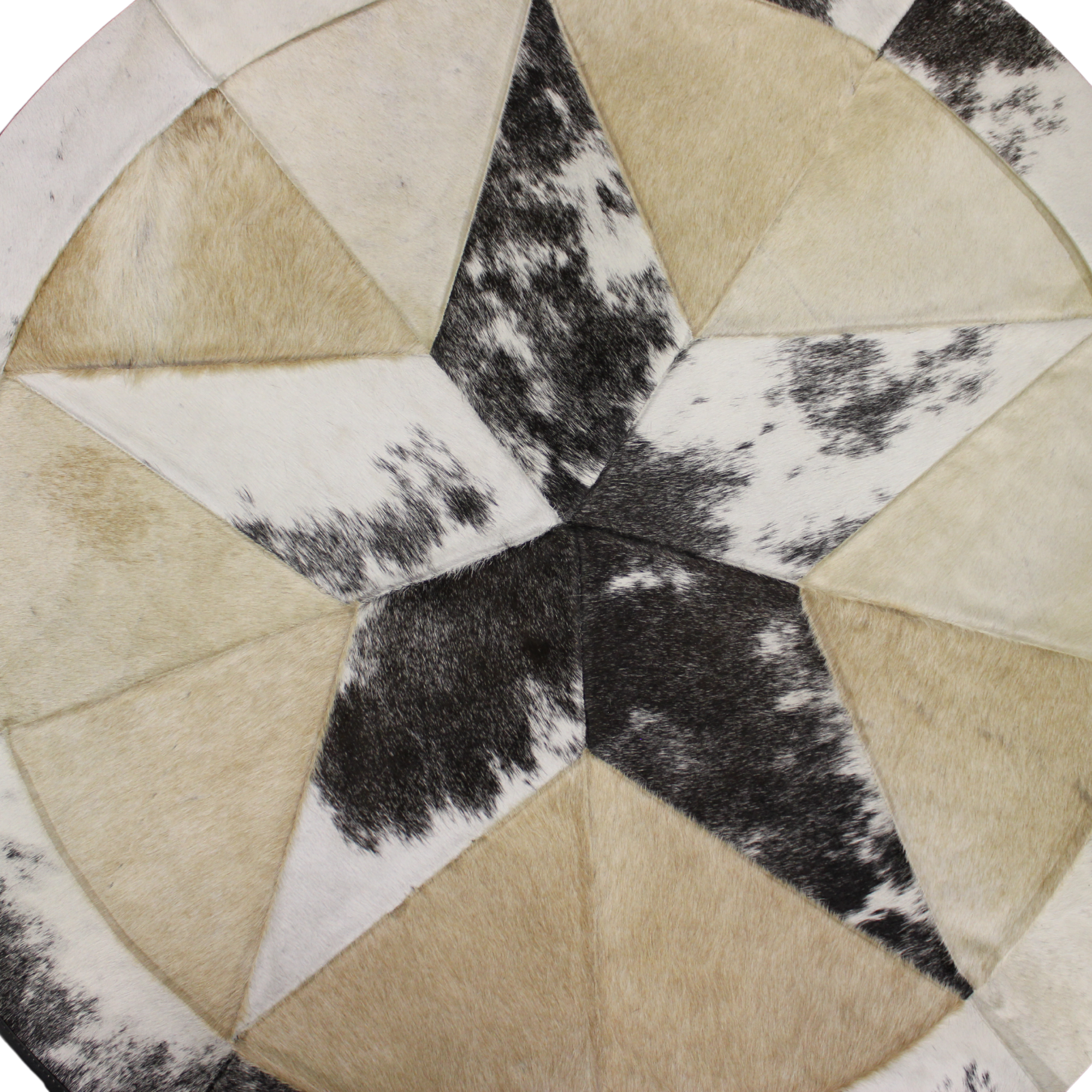 This Round Patchwork Cow Hide Rugs has a special detailed geometric Star figure, zig zag stitching that gives a sophisticated and unique touch. Our round Patchwork Cow Skin Rug bring a distinctive elegance factor and great style to your home or office.
