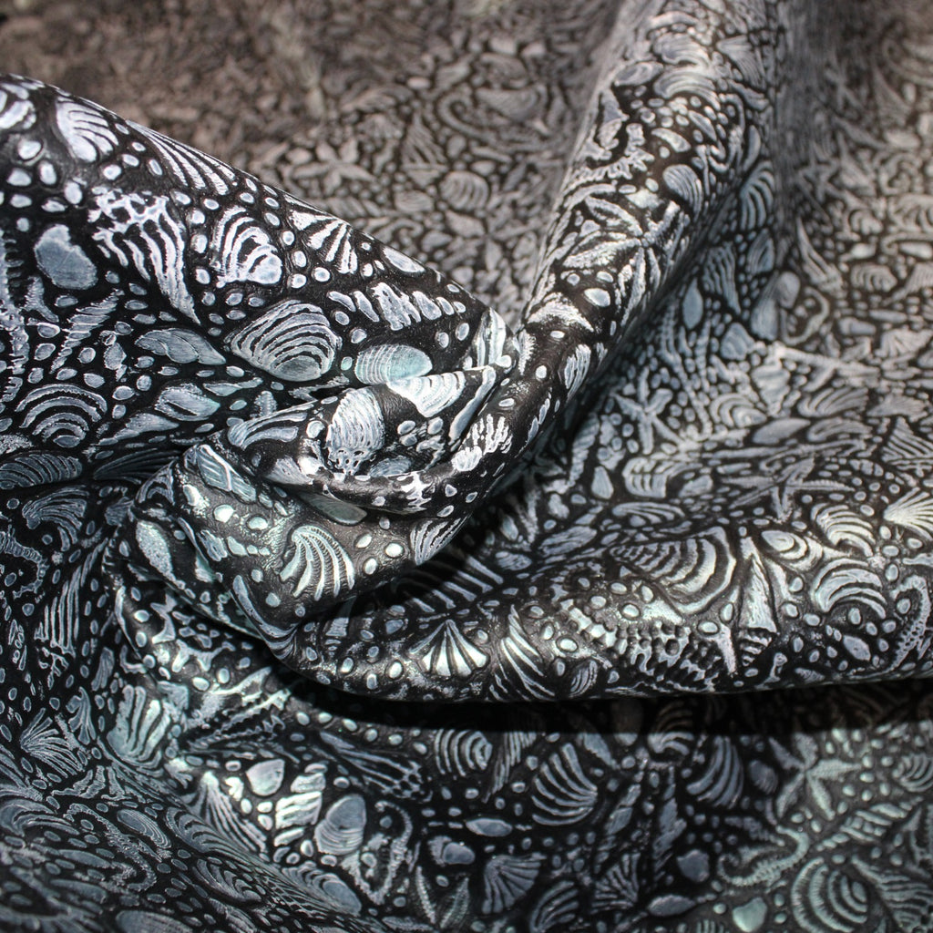 Sea Life Embossed Leather Black Silver : Leather 3 .5- 4.0 oz. | 1.4 - 1.6 mm - Cowhide Leather for Projects - Seahorses, star, shell